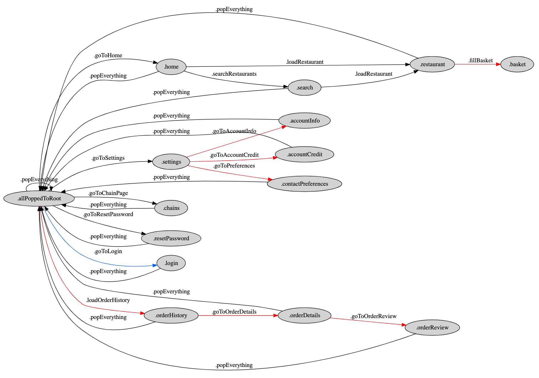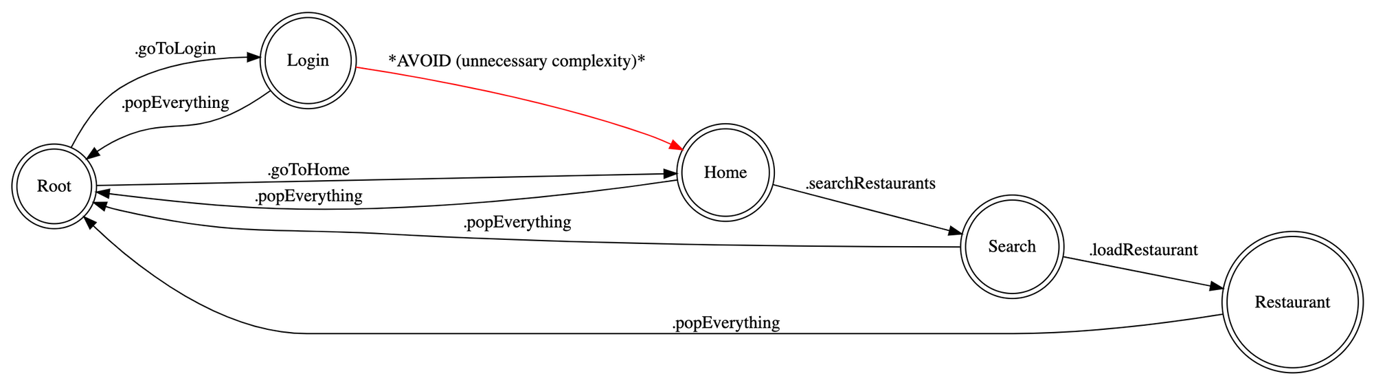 Note that every state should allow going back to the .allPoppedToRoot state so that, regardless of what the current state of the app is, we can always reset the state and perform a deep linking action starting afresh. This drastically simplifies the graph, avoiding unnecessary transitions such as the one shown in the next picture.